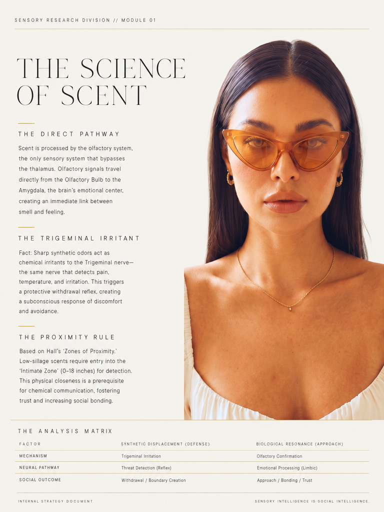 Attraction is not a choice; it is a chemical reaction. While the rational brain processes words and logic, the Olfactory System sends signals directly to the Limbic System; the brain’s ancient seat of emotion, memory, and desire.
